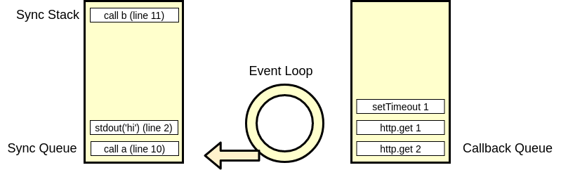 The classic solution is to use a thread to wait on the response, and when the call comes in on the other thread, we interrupt the current thread, and insert our data into the message queue. However, as we discussed in the previous article , we avoid threads because of the memory requirements and the latency overhead of context switching. The nice thing about threads is that you don't need a schedular. When a thread comes back with some data, we interrupt our main thread, and place that data into our message queue. Without threads, we need a scheduler and a way to execute synchronous code associated with asynchronous code. For instance, making a get request to google maps API is async, logging to stdout is sync. Our sheduler is the event loop.